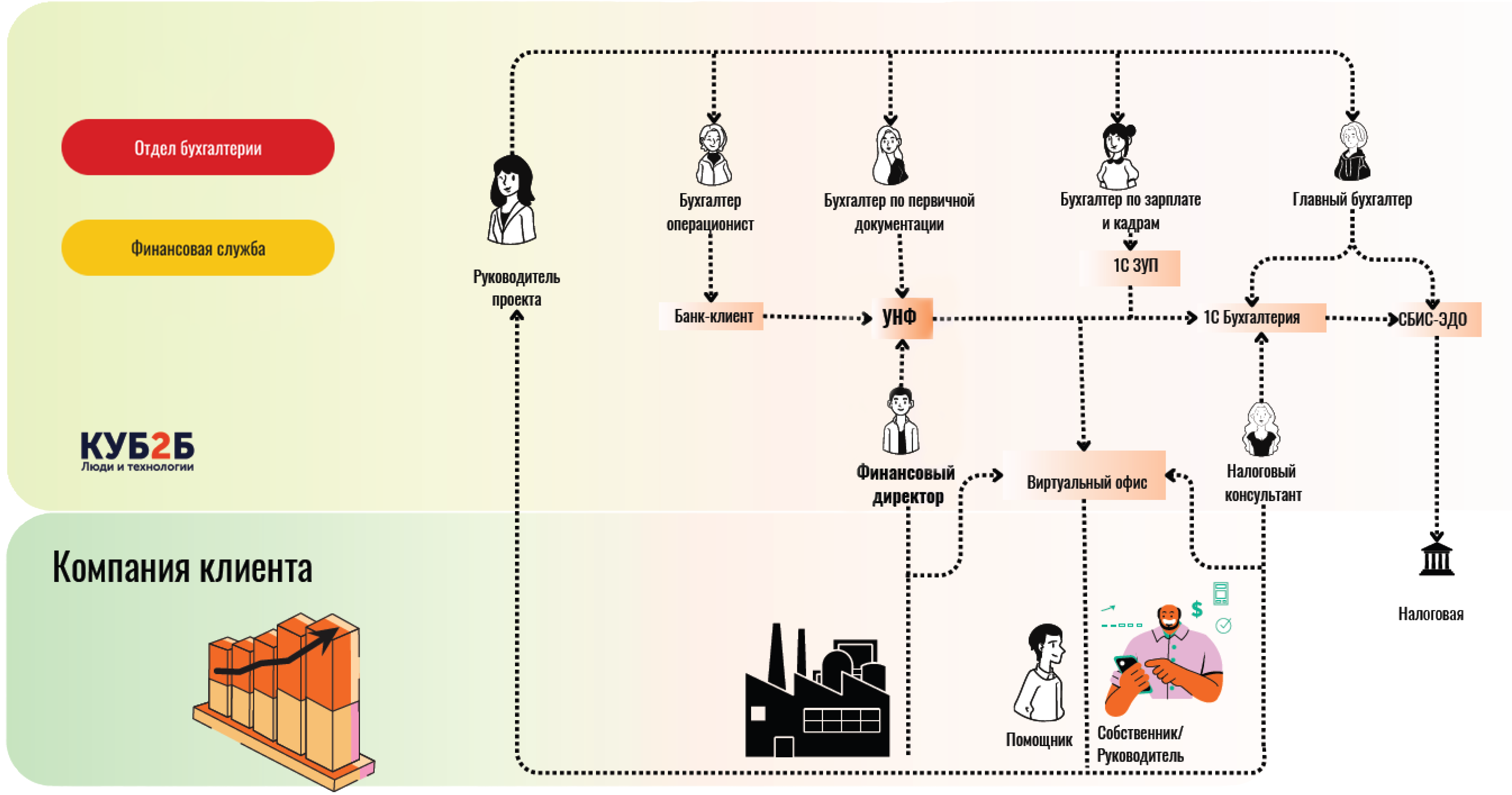 Мы построили уникальную экосистему из программного обеспечения, профессиональной команды с идеально выстроенными бизнес процессами, которую встраиваем в Ваш бизнес и настраиваем безупречный, актуальный и современный финансовый учет в организации.